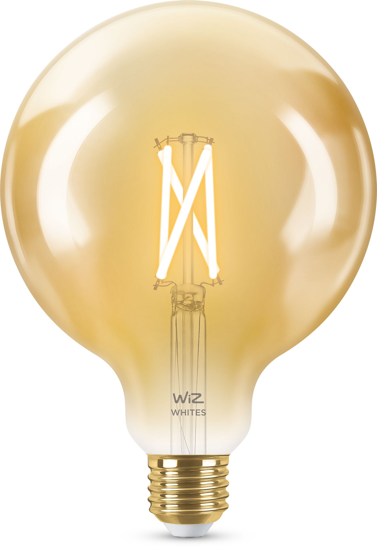 Use this large globe-shaped WiZ smart Filament bulb with an amber coating to get a vintage feel in your lamps and fixtures. Use with the WiZ app or your voice to dim and brighten or use preset light modes on Wi-Fi setups.