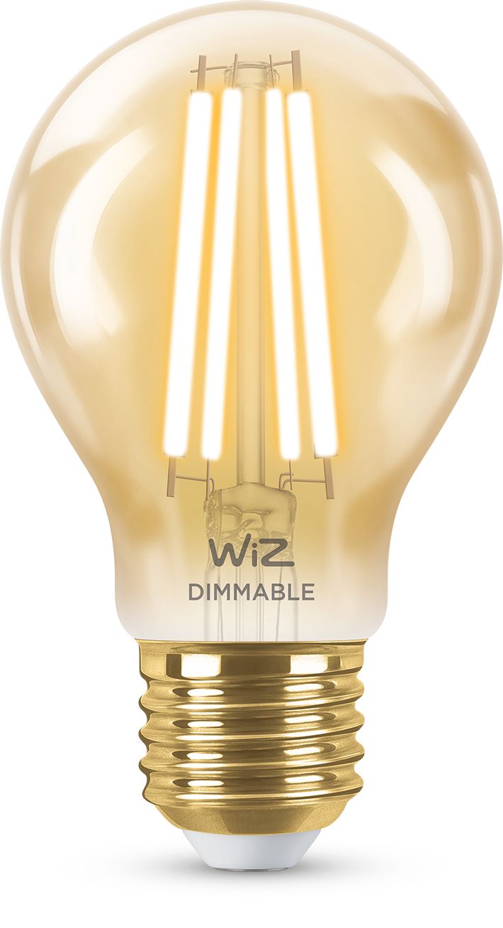 Enjoy more convenience in everyday life with this smart WiZ LED A60 vintage bulb. Amber coated classic look – perfect for decorative fixtures. This bulb gives soft white light that dims to your desired brightness level via app or voice. You can set schedule to turn lights on and off according to your daily or weekly routines, and have remote access to your lights even when you're away. WiZ lights connect to your existing Wi-Fi, no additional hardware is needed.