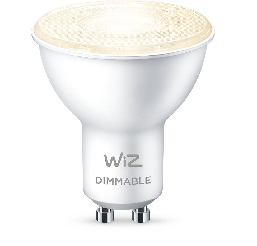 Ajoutez une lumière intelligente blanche chaude, diffuse et à intensité variable, aux luminaires encastrés et spots standard de votre intérieur, avec l'ampoule WiZ GU10. Utilisez l'application WiZ ou votre voix pour un contrôle facile.